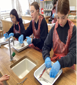 This was the final meet of the anatomy club for this term, and the students dissected a sheep’s brain. As usual they examined the exterior, removing the very tough meninges membrane which covers the entire brain. Then they identified the main structures of the cerebellum and two cortex hemispheres. One large incision was made down the centre to reveal the tissue in more detail. Finally, the students carefully prepared slides of the brain white and grey matter to examine under a microscope. The year 12 student Lucia provided invaluable assistance, as usual.