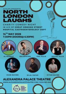 We are delighted to confirm the star-studded line up for North London Laughs Comedy Night at Alexandra Palace Theatre on Thursday 14 May. This is a charity comedy night in aid of the Gastroenterology Department at Great Ormond Street Hospital.