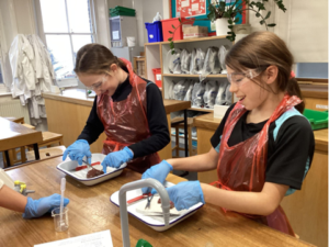 This week the students dissected a sheep’s kidney. These were unusually large with the renal vein, artery and ureter all clearly visible. After some careful incisions, the students sliced the kidneys open to reveal the pyramid, calyces and medulla. Now some hydrogen peroxide was gently applied. Enzymes (catalase) in the kidney nephrons reduced the peroxide to release oxygen, and tiny trails of oxygen bubbles revealed the shape of the nephrons. Penelope then made a slide of the kidney tissue to view under a microscope. Next week we will dissect a frog! Great support again from Lucia K.